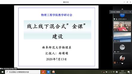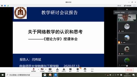 第二阶段为分组研讨,物理系与材料科学系相关专业教师为一组、光电专业群(包括光电信息科学与工程专业、通信工程专业、电子信息工程专业)相关专业教师为另一组。物理系与材料科学系组研讨由物理系主任李刚主持。闫伟斌老师作了题为“关于网络教学的认识和思考—《理论力学》授课体会”的主题报告,闫老师根据自己上课的亲身体会,分享了如何开展好线上教学的宝贵经验。报告结束后,本组教师对线上线下教学模式进行了深入研讨。光电专业群组研讨由电子与通信工程系主任王玉德主持。徐国娟老师作了题为“《电路分析》课程线上教学的实践探索”的主题报告,徐老师采用“钉钉+雨课堂”嵌套式教学平台,灵活运用EV录屏与QQ群进行线上辅导答疑,将线上教学模式表现的丰富多彩。报告结束后,本组教师对光电专业群教学方法与模式进行了深入研讨。