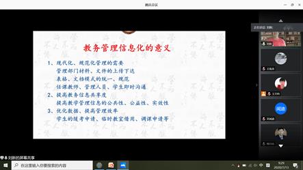 全体教师参加,共有三个主题报告。王玉德老师作了题为“新形态教材建设与混合式教学模式”的主题报告,对近期关于教材建设和混合式教学模式的重要文件进行了详细解读,并结合自己的教学工作提出了一些思考和建议;郑萌萌老师作了题为“线上线下混合式金课建设”的主题报告,详细解读了如何进行“金课”建设,分享了线上教学积累的成功经验;刘新老师作了题为“信息化教务管理系统的应用与思考”的主题报告,对教务系统的功能进行了详细解读,对老师们平时遇到的常见问题进行了细致回答。