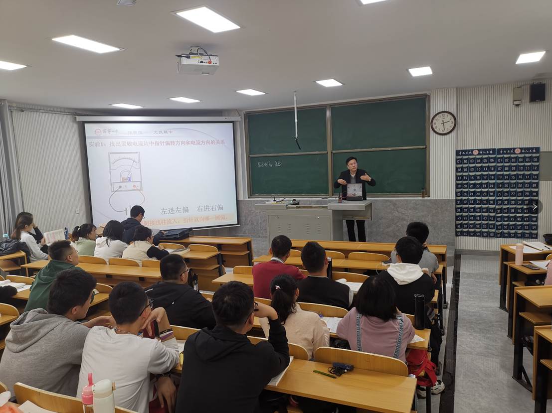 课程论兼职教师夏晓东在物理楼3阶1教室,为2018级物理学师范生展示了一场生动精彩的观摩课。课上,夏晓东老师首先选取《普通高中物理课程标准实验教科书 物理 选修3-2》中的“楞次定律”作为案例,进行了一堂完整课堂授课。然后与学生谈了他对这节课的教材分析、如何组织设计教学环节、怎样确定本节课的教学重难点的思考和心得,与学生交流了物理规律教学的设计思路和教学中应注意的问题。随后,夏老师又以校友的身份,跟同学们分享了他的成长历程,鼓励同学们要努力学习专业知识,提高自己的业务技能,为将来从师打下良好的基础。