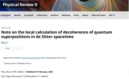 课题组还进一步讨论了由于宇宙学视界的存在而引发的量子叠加态退相干问题,通过建立退相干速率与局域两点关联函数之间的定量关系,具体计算了在标量场、电磁场和引力场背景下的纠缠粒子数,揭示了退相干效应可以在de Sitter时空中实现,量子空间叠加态通过向宇宙学视界辐射纠缠粒子而发生退相干。该研究成果发表在《Physical Review D》。