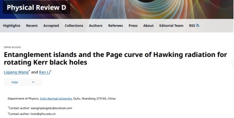 黑洞Hawking辐射引出了一个非常有趣的理论难题:黑洞信息问题,即黑洞蒸发是一个从纯态向混态的非幺正演化过程,不能保证量子信息的守恒。然而,AdS/CFT对应的提出改变了人们的看法。AdS/CFT对应声称AdS时空的引力理论与边界上的共形场论(CFT)对偶,从而AdS黑洞的蒸发可以由边界CFT来描述。这使得人们相信黑洞蒸发是一个幺正过程。近年来,Hawking辐射纠缠熵孤岛规则的提出被认为是此领域最具影响力的进展之一。课题组首次将孤岛规则推广到四维转动Kerr黑洞,发现非极端Kerr黑洞的Hawking辐射的纠缠熵随时间演化呈现出Page曲线行为,并在晚期趋于Bekenstein-Hawking熵。对于极端Kerr黑洞,虽不能确定其Page曲线,但晚期的纠缠熵同样趋近于其Bekenstein-Hawking熵。这些结果表明,孤岛规则有望为旋转黑洞的信息问题提供一个半经典层面的解决方案。相关研究成果发表在PRD,其中本科生王力强同学为论文第一作者,研究内容为其本科毕业论文的主要成果,体现了NBA投注平台