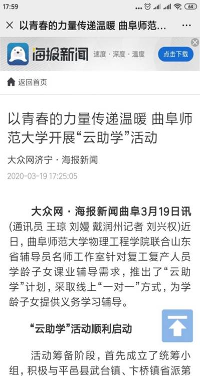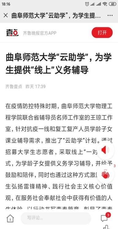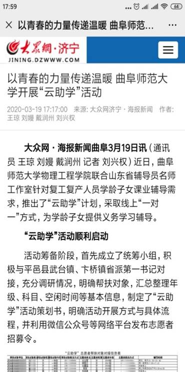 “云助学”活动的开展,同时受到了媒体的关注,学习强国、中国青年网、大众网、齐鲁晚报等媒体平台纷纷报道了活动开展情况。
