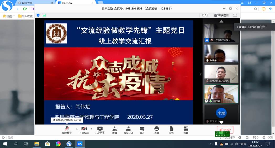 教工第一、二党支部通过腾讯视频会议联合开展“交流经验 做教学先锋”主题党日活动。活动由教工第二党支部书记王玉德同志主持。