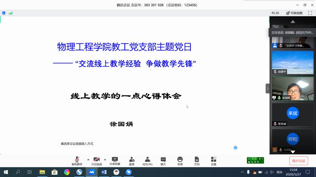 线上直播教学中表现优秀的闫伟斌老师和徐国娟老师,结合自己所教课程,从教学平台的筛选、教学用具选择和准备、教学课件的设计、教学过程的师生互动、辅导答疑、课堂思政等环节向与会党员介绍了线上教学经验。两位老师的经验分享使大家得到了很大启发。