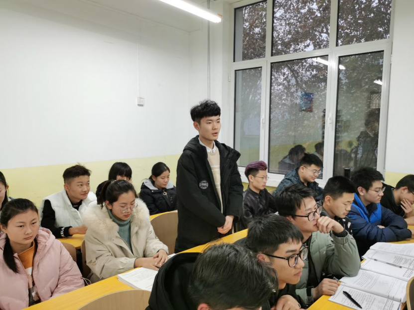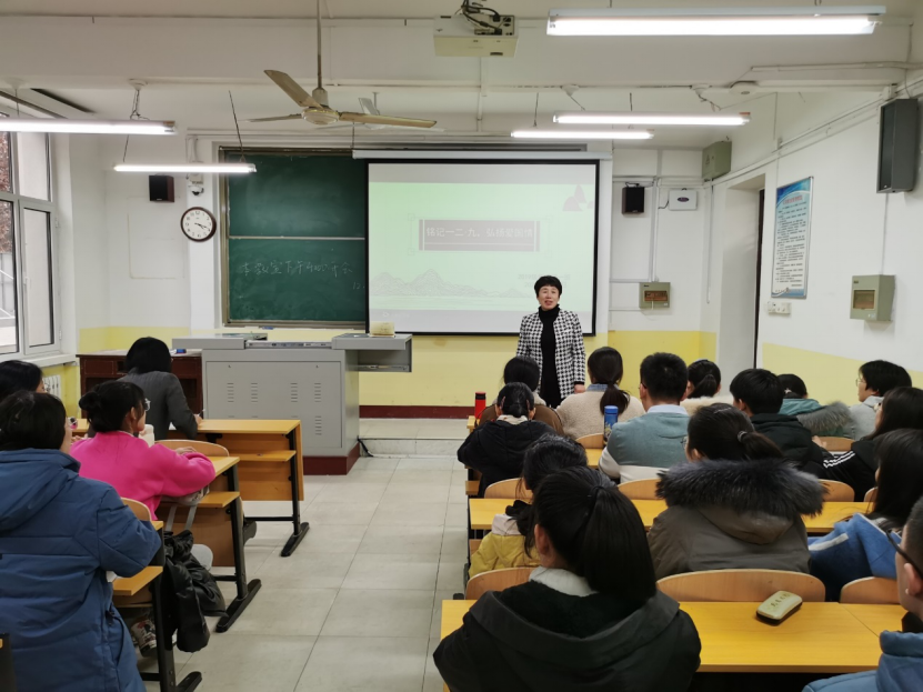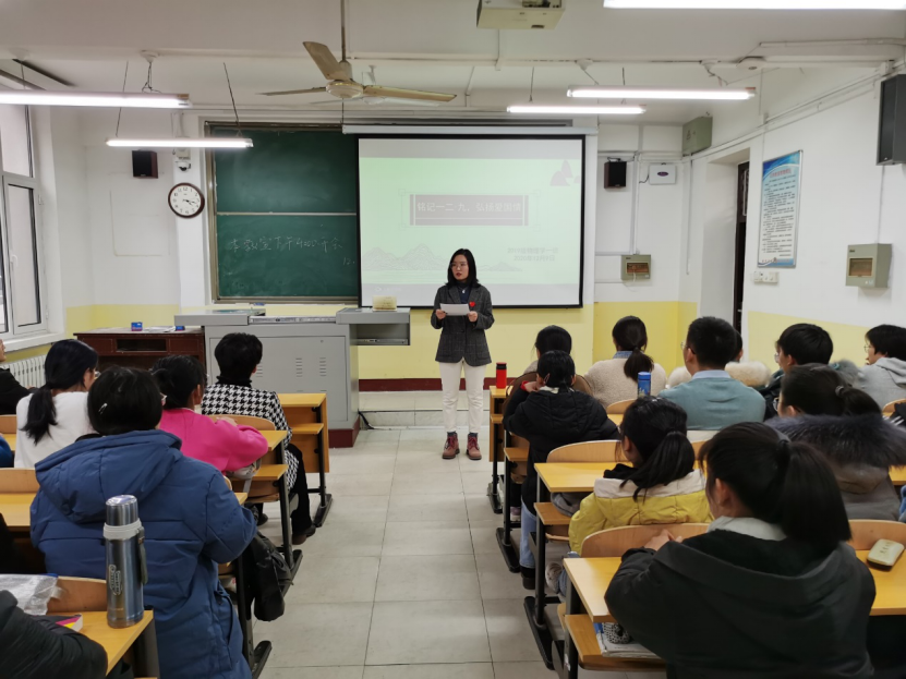 党委书记杨志英、辅导员邱金芝和2019级物理学一班全体学生参加班会。