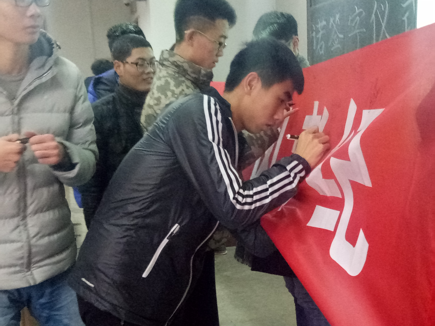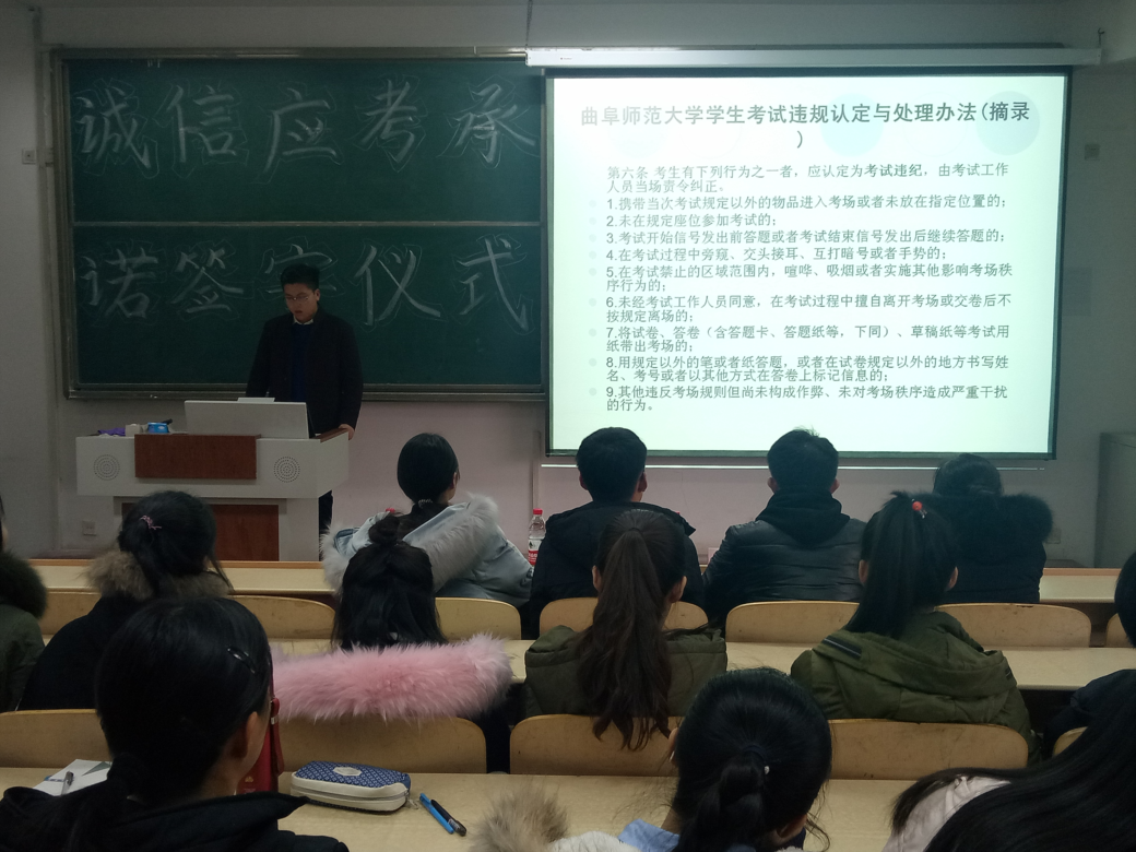 学生会办公室在实验中心A202教室举行诚信应考承诺签字仪式。学生会主席陈相全,副主席陈婷、唐宝坤、马菁雯、杜林倩出席仪式。各班学生代表积极参加此次活动。