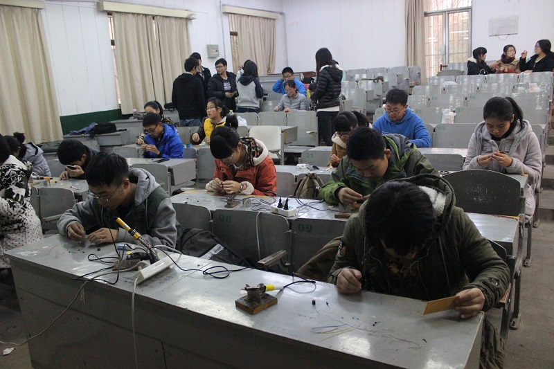 复赛的比赛内容为多谐振荡电路的焊接,比赛时间为40分钟,选手共分4组进行比赛。首先由工作人员向参赛选手讲解比赛要点以及注意事项。比赛过程中,参赛同学严谨认真,将发光二极管等零件焊接于电路板上,工作人员在一旁监督计时,保证了比赛的公平公正。比赛结束,工作人员将作品连接电源检查结果并进行计分统计。