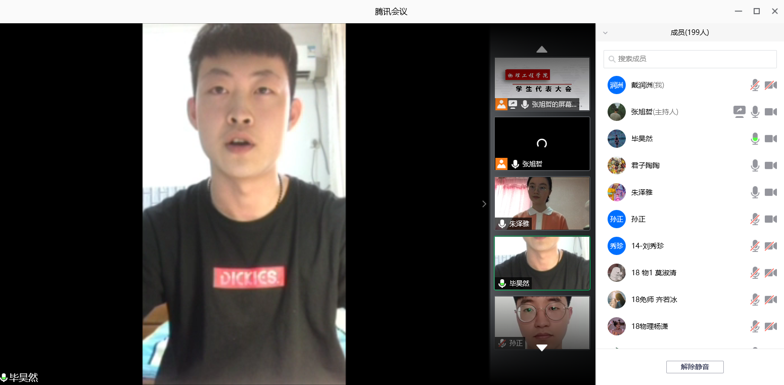 利用腾讯会议线上召开2020年学生代表大会。团委书记王琼、辅导员颜冲、李靖靖出席本次会议,学生代表参加会议,其中非校、院级学生会组织骨干的学生代表约占66%,符合会议要求。会议由第39届团委学生会副主席朱泽雅主持。