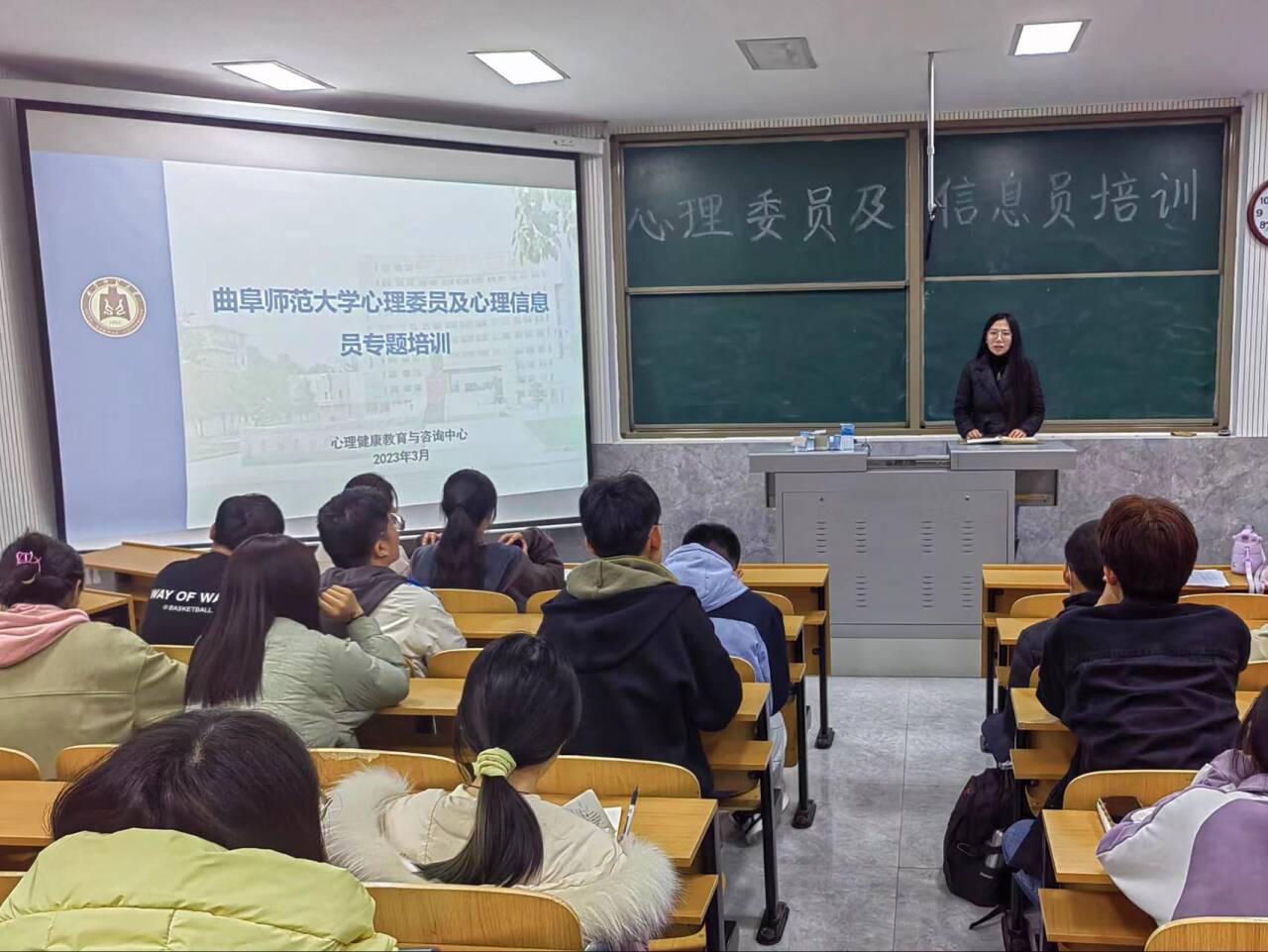 于物理楼二阶一教室召开心理委员及心理信息员专题培训会。本次培训由心理辅导员朱佳文主讲,各班心理委员及心理信息员参加培训。