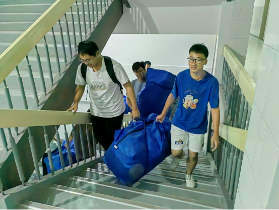 新生辅导员带领志愿者为新生寝室搬运床垫被褥。搬运分发现场,同学们互帮互助、协同合作,有序将被褥从货车搬运分发到新生宿舍,为新生提供贴心的服务,保证新生入学后顺利入住。