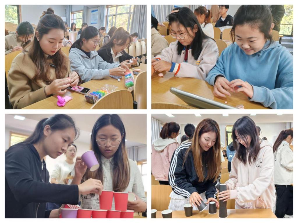 分配组别后,同学们发散思维,玩转黏土,运用缤纷色彩,塑造生动作品。黏土DIY作品展示时,同学们互相分享经验,体验手工乐趣,释放内心压力。叠罗汉活动中,团队成员通力合作,配合默契,在紧张的氛围中保持冷静,不断调节身心状态,最终取得成功。