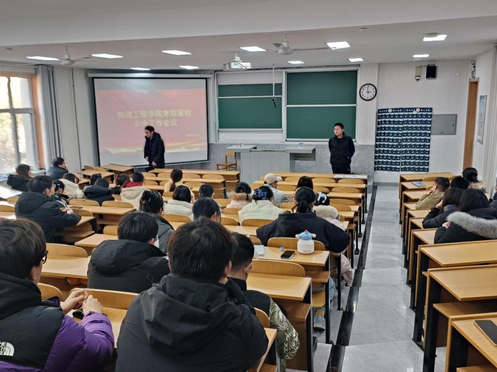 于物理楼三阶一教室召开寒假留校学生安全工作会议。会议中,辅导员张谷天传达了《关于寒假期间学生管理工作相关事宜的通知》,要求同学们遵守各项管理规定,强调留校期间的宿舍安全、校园安全、消防安全、实验室安全等多方面内容,希望同学们牢固树立安全意识,共同营造安全稳定的和谐校园环境。