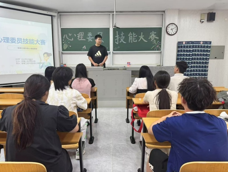 于物理楼二阶一举办心理委员技能大赛。辅导员朱佳文担任评委,各班心理委员积极参与。