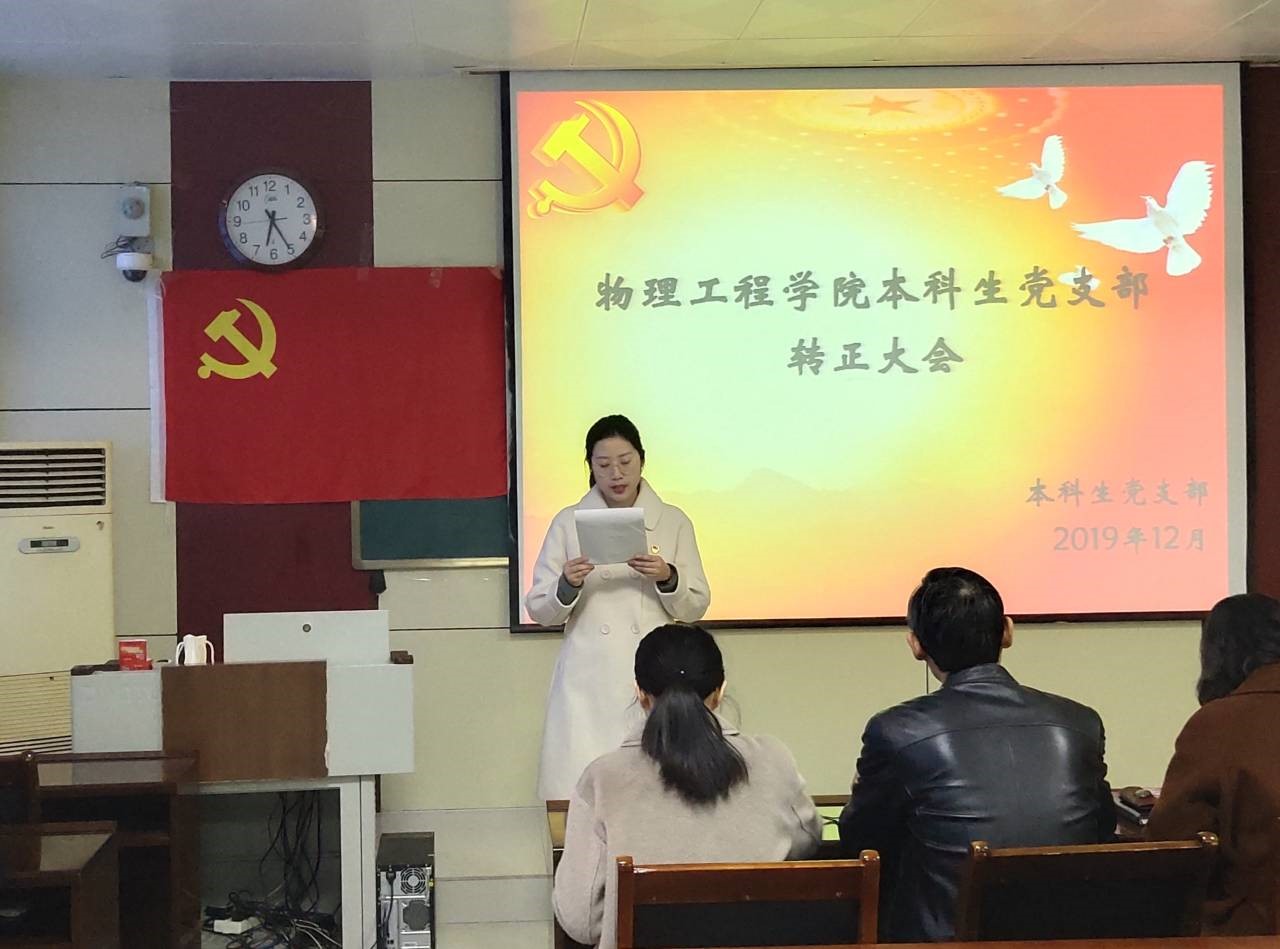 本科生党支部在物理楼313会议室举行本科生党支部预备党员转正大会,本科生党支部书记王琼,辅导员李爱国、颜冲、李靖靖出席大会。本科生党支部全体党员参加。大会由组织委员李靖靖主持。