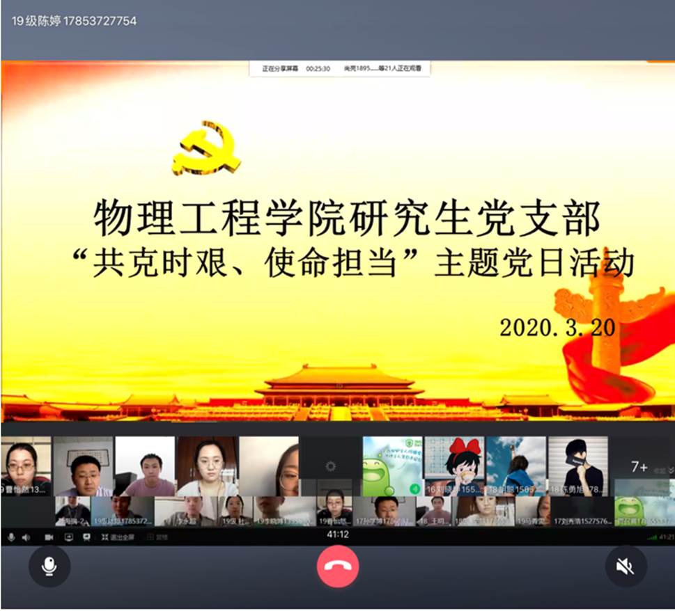 研究生党支部利用QQ群电话网络平台开展“共克时艰、使命担当”线上主题党日活动,研究生党支部全体党员参加,活动由支部书记孙海瑞同志主持。