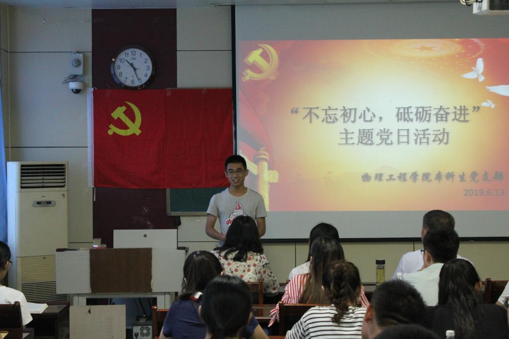 本科生党支部于院楼313会议室举行“不忘初心,砥砺奋进”主题党日活动。毕业生党员和支部其他成员参加本次活动,活动由党支部书记王琼主持。