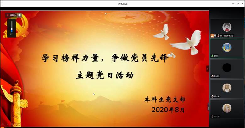 本科生党支部利用腾讯会议网络平台开展了“学习榜样力量,争做党员先锋”线上主题党日活动。本科生党支部书记王琼,辅导员李爱国、颜冲、李靖靖出席本次活动,本科生党支部全体成员参加。活动由颜冲同志主持。