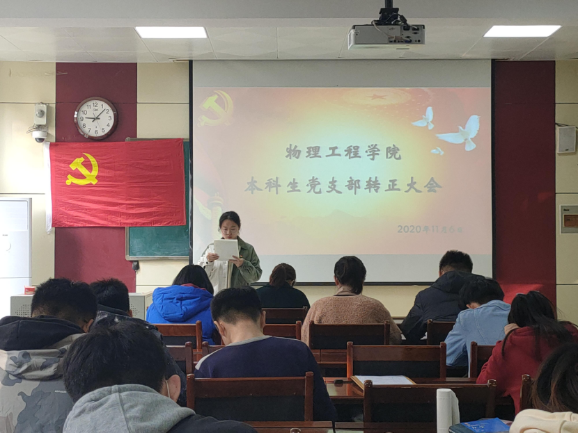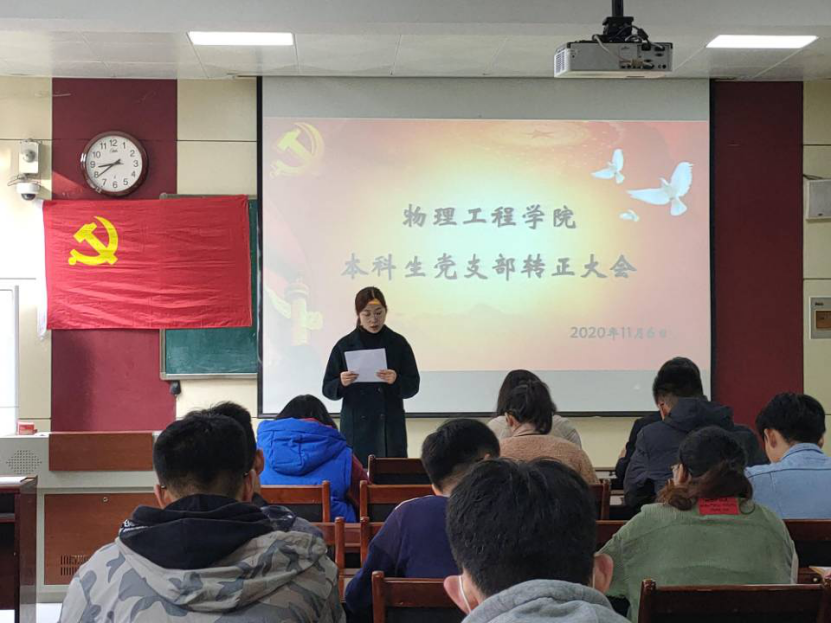 本科生党支部于物理楼313会议室召开本科生党支部预备党员转正大会,本科生党支部书记王琼,辅导员李爱国、颜冲、邱金芝、孔瑞、王衡出席会议,本科生党支部全体党员参加会议。本次会议由组织委员颜冲主持。