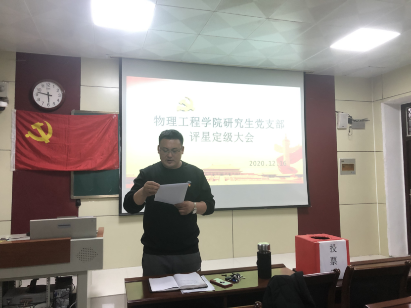 相关通知要求,12月16日下午,研究生党支部在物理楼313会议室召开党支部评星定级民主测评会,研究生党支部全体党员、群众代表参加,会议由支部书记孙海瑞同志主持。