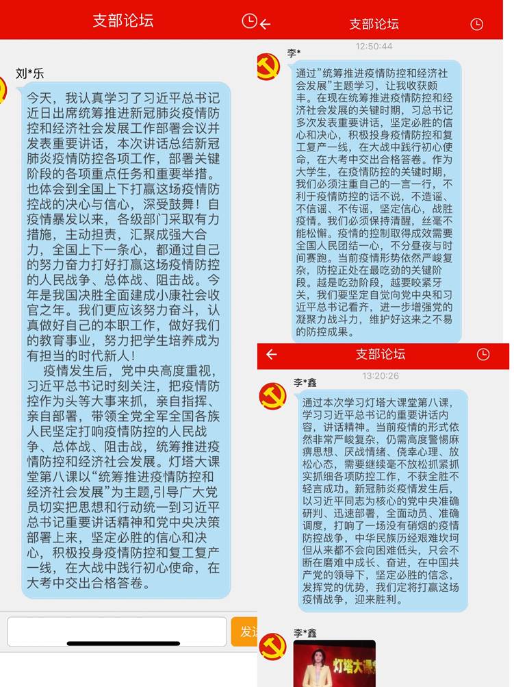 自学完成后,全体党员通过山东e支部互动交流模块进行线上交流。大家纷纷表示,一定要把习近平总书记在统筹推进新冠肺炎疫情防控和经济社会发展的重要讲话和党中央决策部署学习好、贯彻好、落实好,要始终发挥党员先锋模范带头作用,服从组织安排,在关键时候冲的上去,危难时刻豁得出来,在大战中践行初心使命,在大考中交出合格答卷。