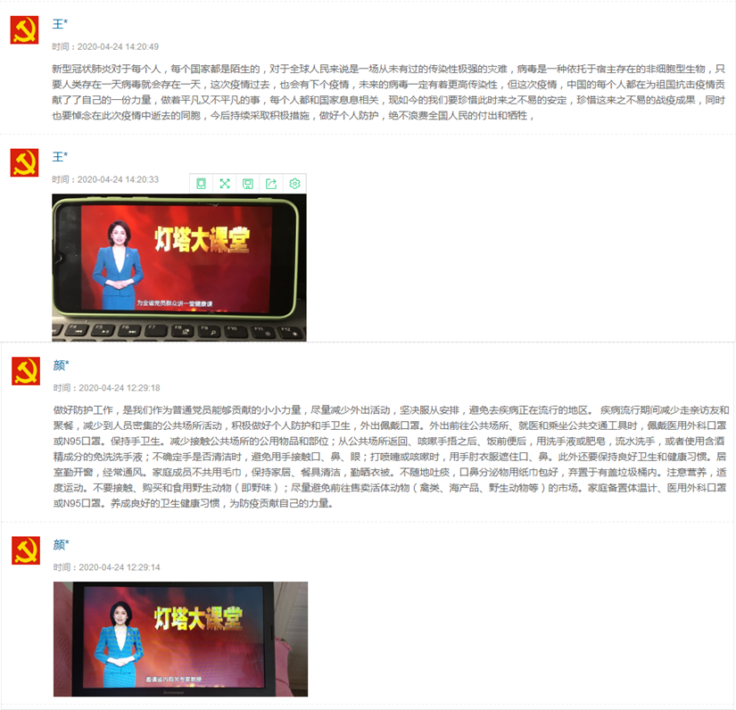 最后,全体党员通过山东e支部互动交流模块进行线上交流。大家纷纷表示,将用科学的态度应对新冠肺炎,切实增强自身防护意识和自我保护能力,同时积极参与爱国卫生运动、文明城市创建、环境卫生整治等活动,为防疫和环境卫生建设贡献自己的力量。
