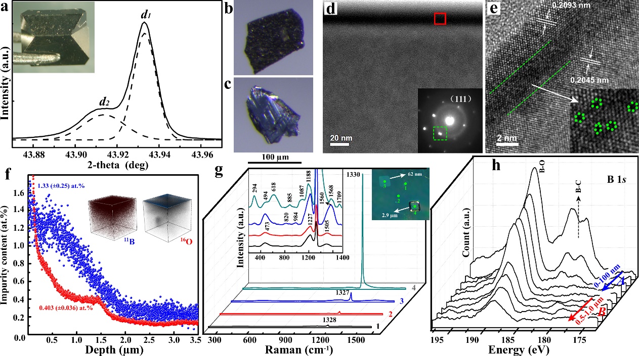 该团队研究发现,在重掺硼金刚石单晶生长过程中,硼原子主要富集于{111}生长晶面,并倾向于与氧原子结合形成B-O复合缺陷,可以在1000 K以上保持稳定。在高温高压条件下,通过调节金刚石晶体中B-O元素的比例,可以实现p型向n型电导转变,且具有极高的载流子浓度(~1021 cm-3),大幅提升了传统硫、磷掺杂n型金刚石半导体的载流子浓度(1017–1019 cm-3)。通过在金刚石结构中构建B-O复合缺陷模型,利用第一性原理模拟发现,B3O与B4O是两种具有浅能级结构的潜在施主杂质,且B-O复合缺陷的形成能较低,因而在高温高压实验条件下最容易形成。该项研究成果为在金刚石结构中寻找新的浅能级施主提供了新思路,是利用极端条件科学装置开展新材料物理研究的典型案例。