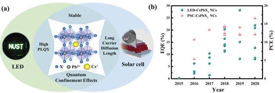图 (上)该论文被编辑推荐为特色(Featured)文章。(下)a、全无机钙钛矿CsPbX3的光电特性及在LEDs和SCs中的应用;b、基于CsPbX3纳米晶的LED和SC的外量子效率及光电转换效率 (2015至2020年)。