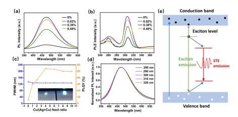 (a) 具有不同铜离子含量的Cs2AgI3PL光谱。(b) 具有不同铜离子含量的Cs2AgI3PLE光谱。(c) 具有不同铜离子含量的Cs2AgI3PLQYFWHM(d) 不同激发光波长下的Cs2AgI3PL光谱。(e) STE发光原理图。