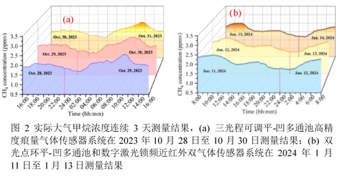 近日,牛明生老师课题组基于可调谐二极管激光吸收光谱技术(TDLAS)研究了三光程可调平-凹多通池高精度痕量气体传感器系统和双光点环平-凹多通池和数字激光锁频近红外双气体传感器系统,可用于多组分气体同时检测。其中,三光程可调平-凹多通池高精度痕量气体传感器系统在基长为0.5m的情况下实现了64.5m, 42.5m 20.5 m的有效光程;双光点环平-凹多通池和数字激光锁频近红外双气体传感器系统,在基长为0.5m的情况下实现了129 m, 107 m, 85 m, 63 m 40 m的有效光程。对甲烷探测的灵敏度分别达到21 ppbv(体积浓度比:1ppbv=10-9)和8 ppbv,并对校园内大气中甲烷浓度变化进行了连续72h的监测。相关成果分别发表在了中科院二区期刊Optics and Lasers in Engineering, 2024, 175, 108023Optics Express, 2024, 32(8), 14169-14186上。本课题组研究生胡振、李桃花、李辉和本科生史永鹏做了大量工作。