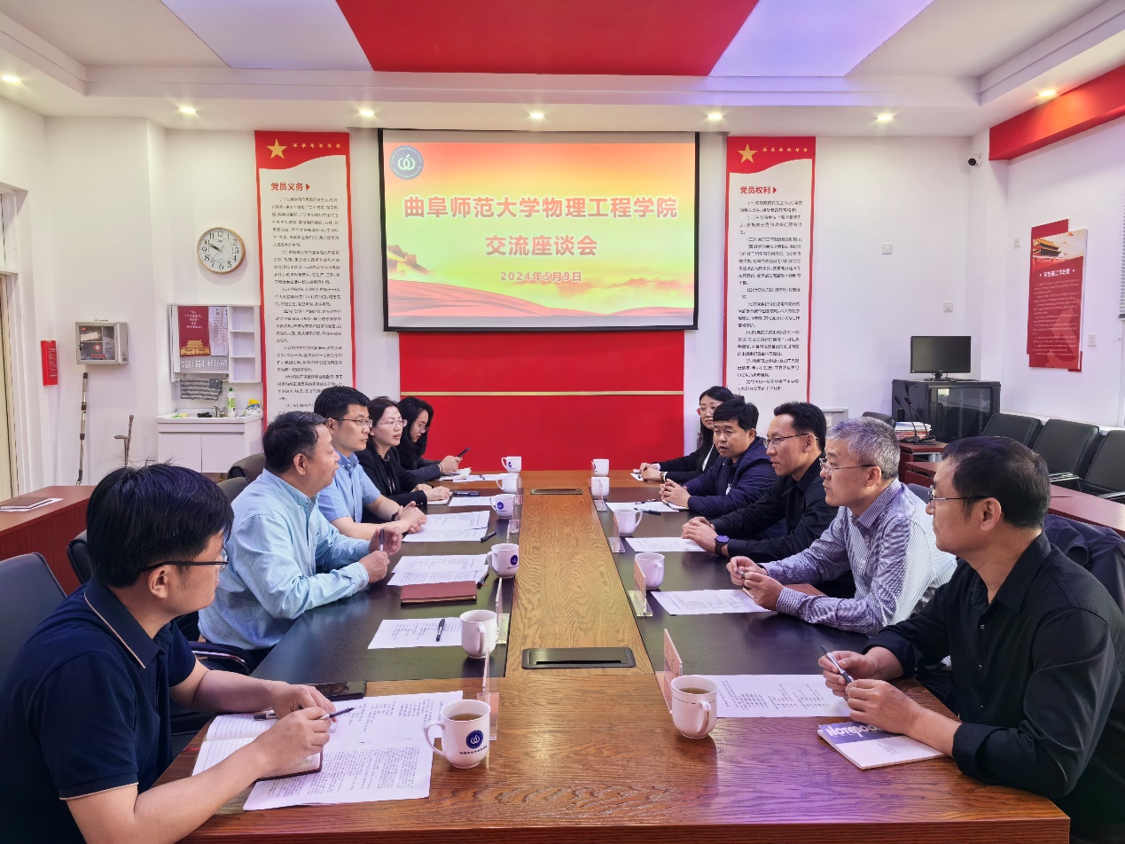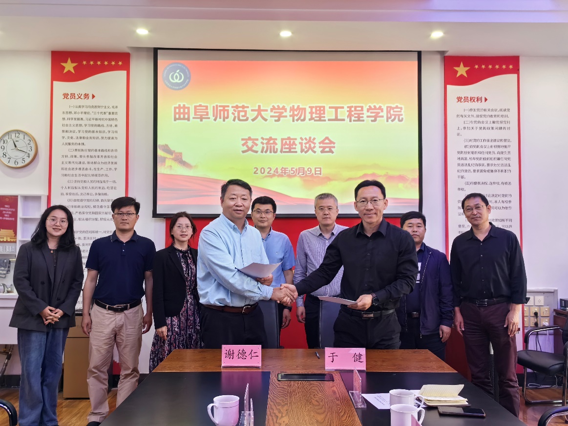 党委书记谢德仁、党委副书记兼纪委书记杜伟、副院长宋玉志、王晶晶、学术副院长张超、学工办主任兼团委书记方芳参加了座谈会。在座谈过程中,双方就党建、科研、招生就业、人才培养、学科竞赛、综合评价招生、本科生培养等方面进行了深入交流。双方同意签订“党建共建”协议,进一步加深两院沟通,以党建引领高质量发展,营造双赢局面。会后,前往展厅、青年之家、光场调控中心实验室进行了参观。