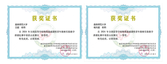 物理基础课程青年教师实验教学讲课比赛中荣获山东赛区特等奖1项,一等奖1项;本年度获校级教学创新大赛一等奖1项,二等奖1项,三等奖2项;获校级青年教师教学比赛二等奖1项,三等奖2项。