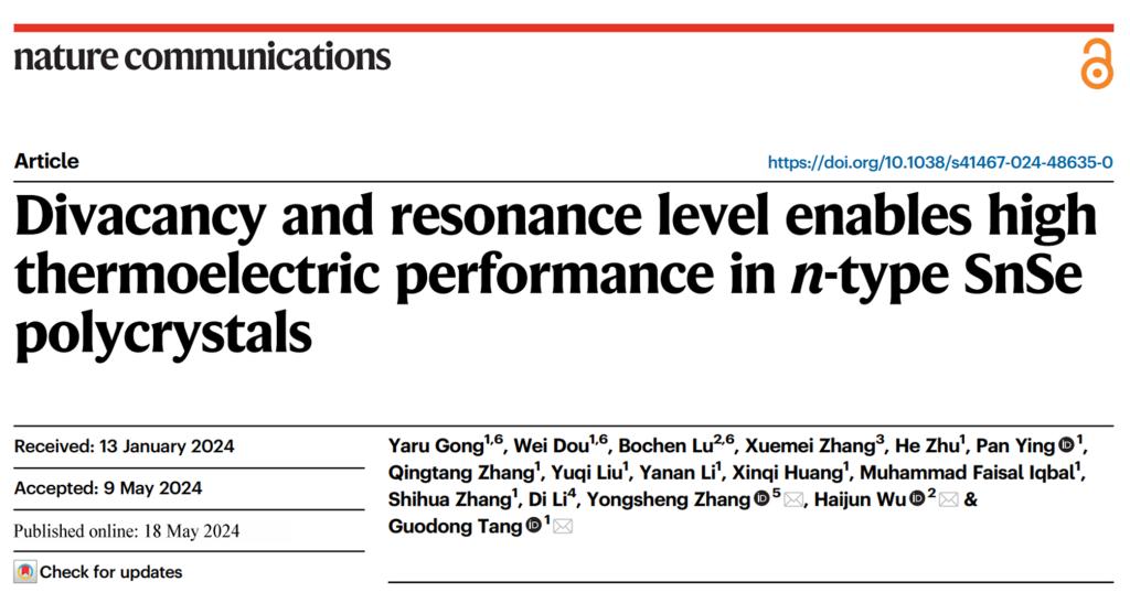 高压科学研究团队在n型多晶SnSe热电性能研究方面,通过理论和实验结合实现了n型多晶SnSe热电性能的突破,解决了热电材料领域内长期困扰的技术难题,相关成果发表于《自然-通讯》(Nature Communications, 15, 4231, 2024)。