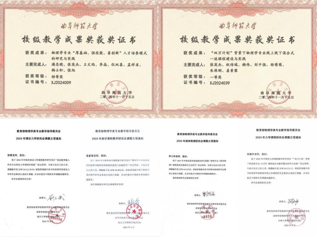 成功获批教育部物理学教学指导委员会教改项目4项,校级教改项目3项,校级课程思政示范课1门,校级教学成果奖特等奖1项,一等奖1项,二等奖3项。其中,1项教改项目推荐参加省级教改重点项目的评审,1项教改项目推荐参加省级L类选题“专项支持项目”的评审。