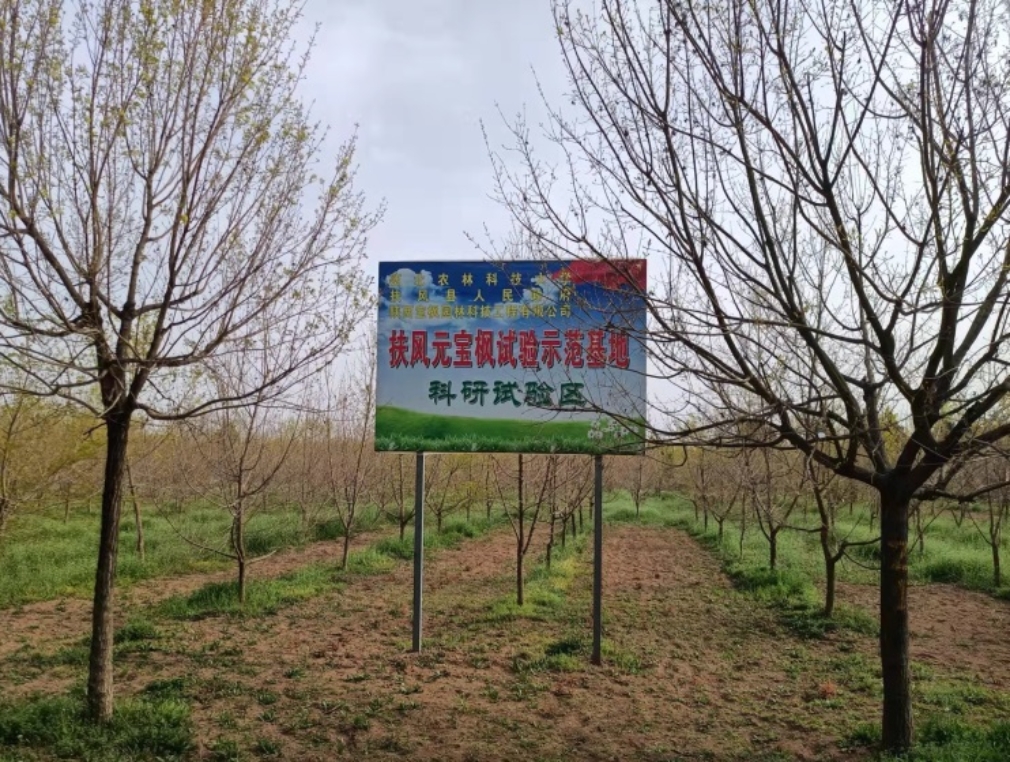 扶风元宝枫试验示范基地位于陕西省宝鸡市扶风县杏林镇西坡村,是西北农林科技大学林NBA投注平台 、扶风县人民政府和陕西宝枫园林科技工程公司于2018年5月联合建立的全国首个集元宝枫产业中关键问题进行科学研究、试验示范与科技推广于一体的产学研综合基地。元宝枫是我国独有树种,也是我国传统的荒山治理先锋树种和环境绿化美化的园林景观树种。元宝枫籽油中高含量的神经酸对于老年人退性型病害有着显著的预防和治疗作用,于是近年来形成了元宝枫栽植和系列产品开发的新型产业链。